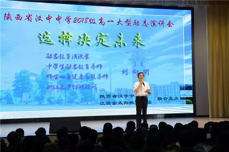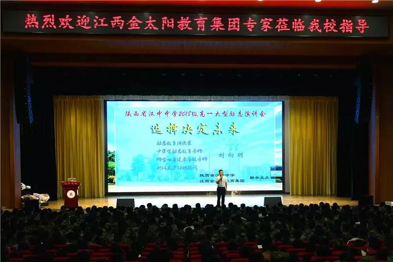 此次演讲会是由陕西省汉中中学和江西省金太阳教育集团联合主办。本次演讲的主讲人是励志教育演说家、中学生励志教育导师、师生心身健康高级导师、“浙江之声”特聘顾问刘向明老师担当。演讲会伊始,文庆华校长在致辞中从学习和生活两个方面对新生们提出了建议及寄语,希望大家能规划好奋斗目标,处理好身份转变,成为合格的高中生。