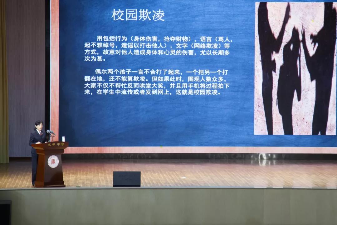 随后,丁鹏敏检察长向我校学生做了《扫除阴霾,守护校园晴朗天空》的法治报告,介绍了检察机关的职能和法治的具体内涵,为我校高一学生普及了法律知识。她以“远离校园暴力”这一话题为切入点,结合当前法治形势,利用真实具体的案例,深入浅出,循循善诱,引导学生知法、守法,将违法犯罪屏蔽在校园之外,强化了学生的法治意识,培养了学生的法治思维,并对我校学生提出增强法治观念,树立法律信仰的希望。丁检察长为我校学生上了一堂生动精彩的法治课。